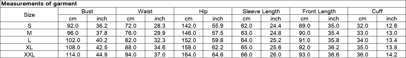 Note: The Measurements of the garment charts may vary due to different products or suppliers.